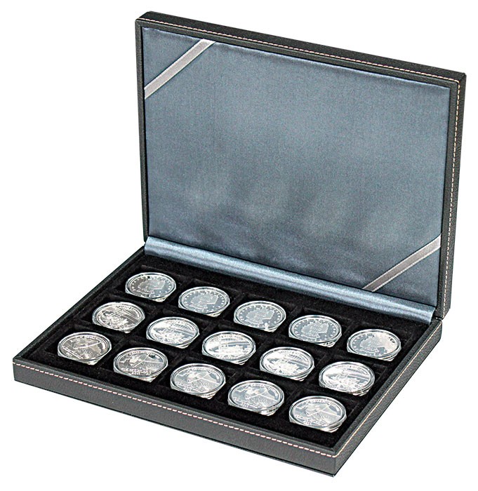 Die Münzkassette NERA XM mit 15 Feldern lassen sich 15 Münzen oder Münzkapseln bis 40 mm Durchmesser stilvoll aufbewahren.